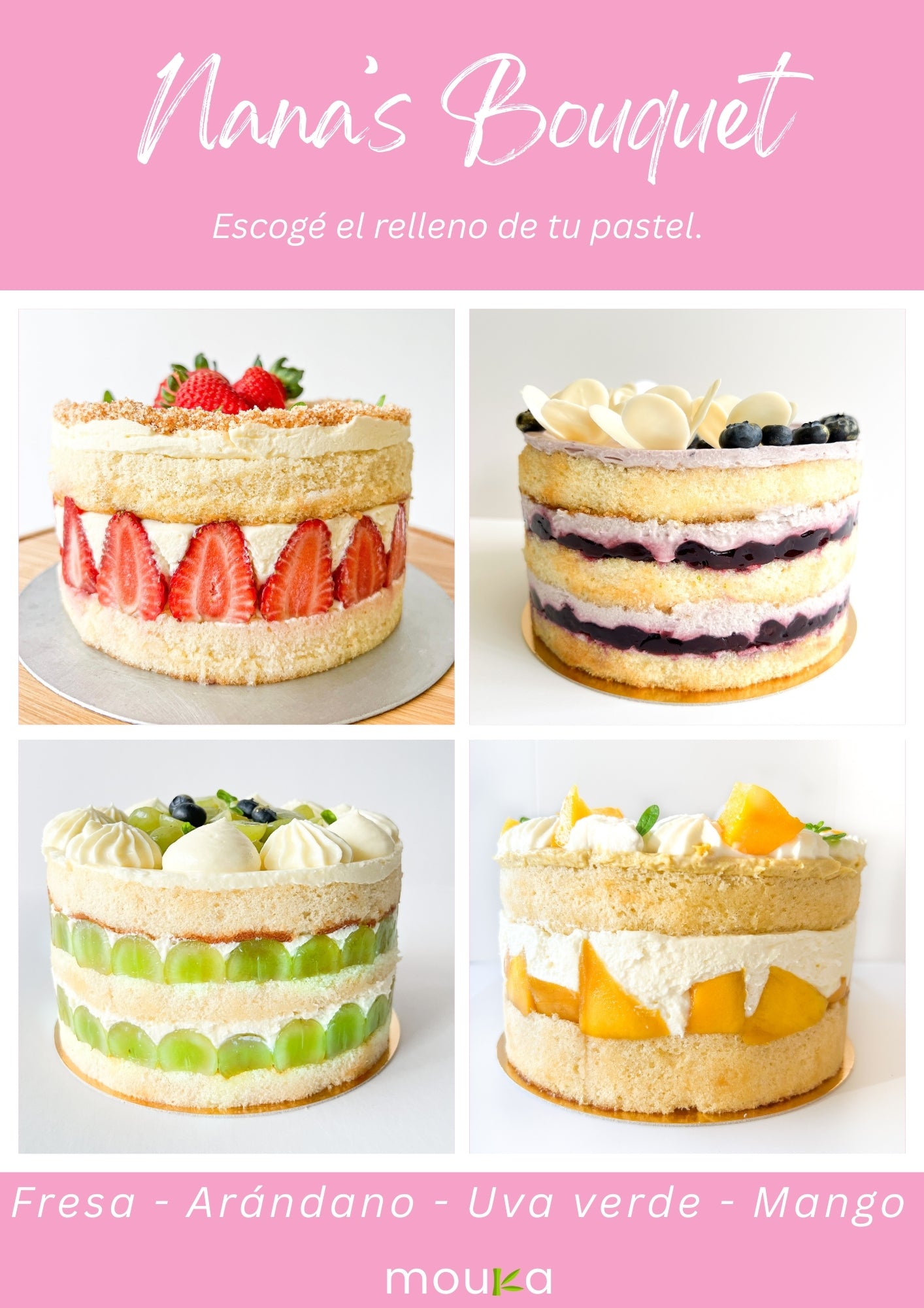 -Sabor a escoger del pastel (fresa, arándano, uva verde o mango-maracuyá)